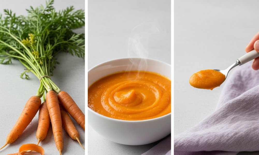 Instructions: Peel and chop the carrots. Steam for 10-15 minutes until tender. Blend with a few tablespoons of water until perfectly smooth.