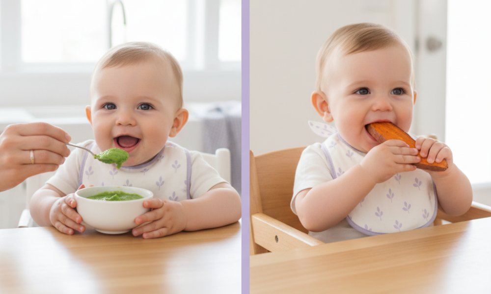 BLW skips purees, offering soft, finger-sized pieces of whole foods for babies to feed themselves.